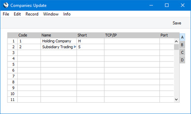 - To add more Companies, click in the Code field in the first blank row and enter information as described in step 5 in the 'Single-user' section above. As described in that section, leave the TCP/IP and Port fields empty.