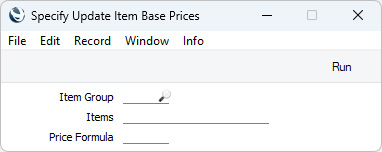 Enter here the Price Formula record that is to be used to recalculate the Base Prices of the selected Items. If you leave this field blank, Base Prices will not be changed.